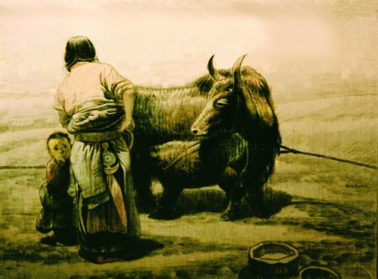 ◎ 赏析2:《黄河的歌》1983,《大河之源》前幅作品也是描绘黄河船工的,如果说上一幅像纪念碑,那么这一幅更像抒情诗。不是画船工的劳作,是画他们的休息。画面上,安静的夜晚,静下来的黄河,溶溶的月光,停泊的大船,船舱中的船工。船工有老有少,有的用饭,有的抽烟,船头一人吹唢呐,大家入神地倾听。悲切而欢快的唢呐,含着风声水声,在静夜中回荡,给人安详静寂中的遐思与憧憬。画法还是水墨写实的,但处理光线比较自由,虚实藏露也都围绕着刻画人物和渲染意境,以静衬动,用无声画有声。在写实的作品中,注入了诗情,富于生活韵味。《大河之源》中杨晓阳对黄河的描绘,投注了极大的热情,这是一套组画,七幅之一。他描绘黄河源头的藏族群众,亲切雍容,淳厚朴素,充满内美,容易使人想到法国米勒的作品,表现了对祖国对黄河儿女的深情,很像是包孕深厚的史诗。他这些水墨写实的作品,发扬了刘文西的传统,体现了黄土画派“熟悉人,严造型,讲笔墨,求创新”的风采,但在开掘动人的诗情上,有了新发展。