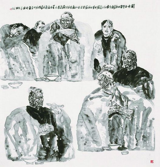 ◎ 赏析6:《关中正午》2003,这幅作品,已经是大写意了。猛一看,像山水,像几块大石,笔酣墨饱,浑厚有力,画法也来源于石鲁、赵望云的长安画派。细看都是坐着的关中农民,有老有小,有男有女,正是田头午休时光,大口吃饭的,静坐吸烟的,抱头小睡的,还有玩耍的儿童,凝思的少妇。画家在画上题道:“关中昔日所见,不求形似,意象亦以阔笔为之,略有意气。”其实,身形有点大象无形,不求细节貌似,但刻画人物面部和双手,绝不掉以轻心。造型大体写实,用笔也不淋漓放纵,而是用顿挫的点线,略加淡墨,描绘岁月的留痕,老农大多突出其历经沧桑而沉静自若,少妇则彰显其朴厚而充满憧憬。画家题词所说的“意气”,显然是对关中农民生存状态的一种发自心底的深层感受。