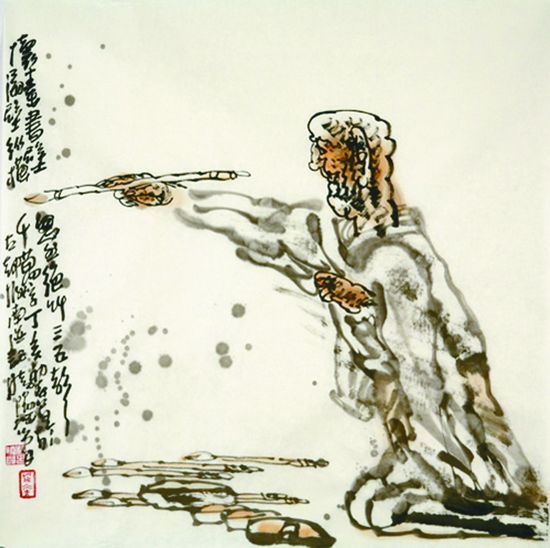 ◎ 赏析10:《怀素书壁》2007,他有一批大写意作品,以达摩面壁、怀素学书为题。通过历史人物的文化积淀,刻画其精神面貌,象征某种精神境界,给人以有益的启迪。这件作品画唐代草书大家怀素和尚。根据《自叙帖》中的“忽然绝叫三五声,满壁纵横千万字”的诗句,画出了怀素的激情,他跪在那里,张口大叫,身体前倾,全力以赴,对壁直书,笔下墨汁淋漓。但身旁是两方大砚、墨盘和无数的笔,这不禁使人想到关于怀素刻苦练字的另一则故事,所谓“笔成塚,墨成池”,杨晓阳把二者概括在一件作品里,虽然画的是激情喷薄,大笔挥洒,但通过细节,点出了画外意,揭示了即兴抒发必须以勤学苦练为基础,含义也就自然深刻了。