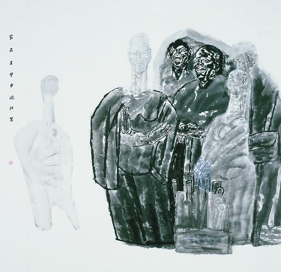 ◎ 赏析7:《农民工》2004,这幅作品画的是农民工,有中壮年,也有青年男女,成组的处理,山石的形态,突出了农民群体的坚如磐石,脚下的工具箱,体现了他们开始从事的工种,面部的神情,显现了他们的坚毅朴实和乐观,拉长的脖子,表现了农村人对城市新生活的向往和期盼。这种大写意的特点,是不拘形似,按照感受和立意的需要,夸张变形。在以笔墨运动实现夸张变形的同时,一是把传统石刻和非洲木雕的感受糅进来,二是发挥以淡映浓,以浓托淡的笔墨对比。乍看粗笔大墨,一气呵成,触目难忘,细细品味,则感到这种奇异、古拙、淳朴、含蓄、厚重、简单的画风中,包容了一种文化含量,一种热爱农民的真情,一种对农民质朴、宽厚之美的讴歌,以及城市化进程的现实感悟。