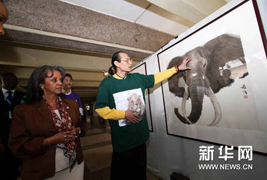6月3日,在肯尼亚内罗毕联合国环境规划署总部,画家董希源(右)向联合国驻内罗毕办事处总干事泽威德女士(前左)介绍自己的非洲象画作。 孟晨光 摄