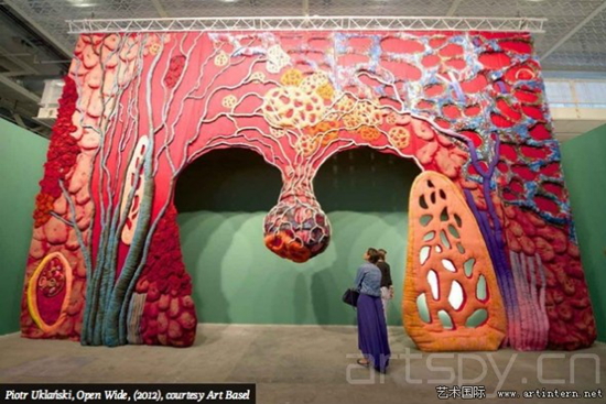 不过现在我被干扰了,我离开去跟一些策展人聊天,在阳台上俯视庭院,空气里都是烤瑞士奶酪的气味。也许是那些柔和、神秘的作品最终在艺术博览会中这样吸引眼球,有点歇斯底里的环境中胜出了。漫步穿越巨大的展厅,在“艺术无限”展厅里,到处都是巨大的雕塑,就像从一个翻倒的喷气机里掉出来的。“艺术无限”空间的审美诉求是要做一个有趣的艺术展。在Piotr Uklański巨大的悬空作品Open Wide (2012)下走过,爬进Atelier Van Lieshout有点臭味的生存主义的玻璃纤维居所Hagioscoop (2012),还得尽量不要被He An的灯光金属管Hubble (2013)弄瞎。