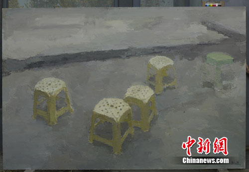 中央美院教师白晓刚的作品以“书”为题材,简约、沉静。白晓刚表示,他想要打破一些学院的习惯。“书,既是静物,又与我们关系很近,提供给我们的不是很多情绪,很安静,我可以回到内心感受。我不需要看到太多情绪、色彩,完全沉下来思考对绘画的认识。画面中要传递的不只是书,更多的是我的绘画感受、绘画态度。”