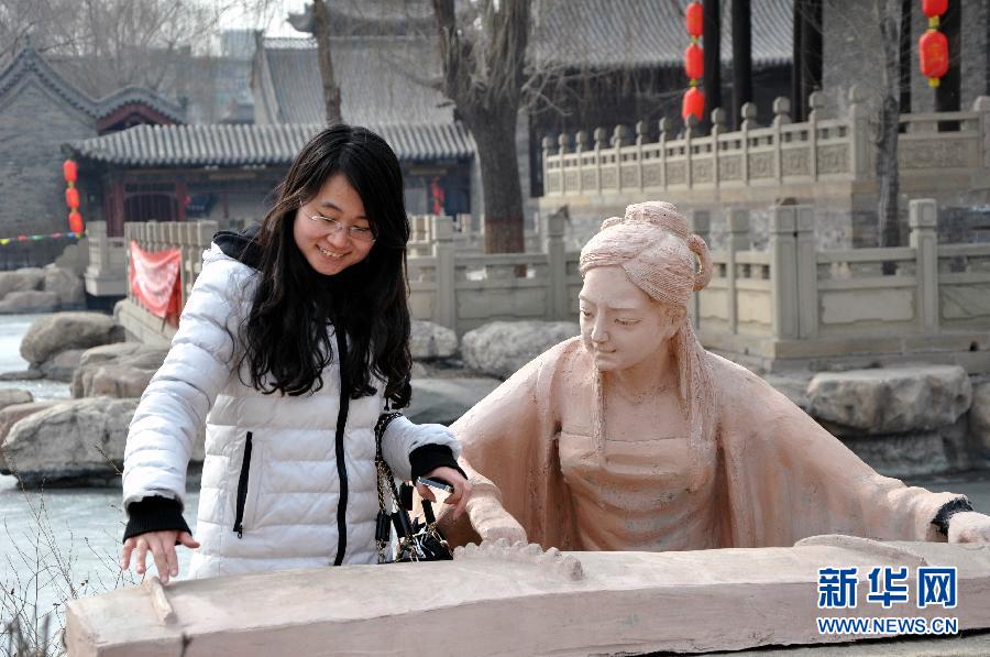 2月23日,在榆次老城新春蜡像展上,一名游客在模仿“蜡人”的弹琴动作。元宵节来临之际,位于山西晋中晋商故里的榆次老城举办了一场古典艺术与现代工艺相结合的蜡像展览,近百件作品把放爆竹、贴春联、扭秧歌等民俗活动通过蜡像展现出来,神形兼备,栩栩如生,吸引了大量游客前来观赏。(新华社记者 王飞航 摄