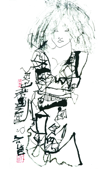 20多年来,石虎没有改变自己的方向,一直行走在探索和创新的道路上。综观他的艺术创作,我认为有下述几个鲜明的特点。首先,他没有给自己的绘画创作加上沉重的负担:意识形态性、论道说教、表达历史事件……他把绘画看作抒情、写意、娱人娱己的手段,自由自在、轻松活泼地画,让观众自由自在、轻松活泼地欣赏。他不装腔作势、不戴假面具,直率地显示其真性情。其次,他用意写的方法,呈现他描绘的对象,人物、花鸟、山水,还有一些情节性的画面。他用简而又简的笔墨、造型、色彩,象征性地暗示或交代,点到为止。在这些简笔后面,又隐藏着他的绘画功力和笔墨神韵,因为这些在画面上出现的人物和物象虽无写实的造型,但富有神采。中国画论中历来有以形写神和以神写形两种学说,两者都讲究形神兼备,但侧重点不同。前者在形中传神,后者略形重神。显然,石虎坚持的是后一条路线。他把写意手法加以强化,在传统写意手法中加进了狂草书法和西方抽象画的元素,通过笔线的运转,传达出内在的力感和韵味,创造了自成一格的意写绘画方法。