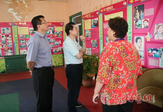 中国曲协分党组成员、副秘书长曲华江,相声表演艺术家常贵田听“太阳村”的张淑琴主任讲解