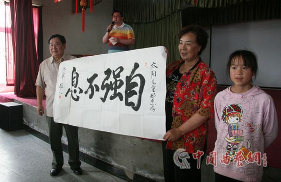 中国曲协分党组成员、副秘书长曲华江代表中国曲艺家协会向太阳村捐赠了书籍。相声表演艺术家赵炎把自己手书的“自强不息”书法力作送给了孩子们,鼓励他们健康成长。