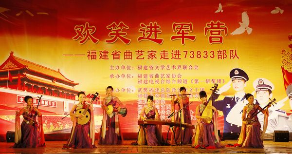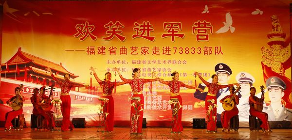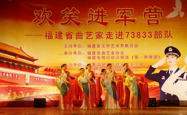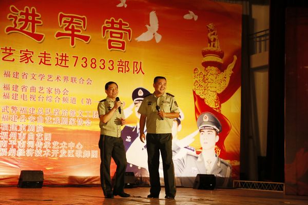 73881部队和73833部队首长、福建省文联、省文化厅等领导与官兵们一道观看了演出。来自武警福建总队政治部文工团、福建公安曲艺戏剧家协会、福建京剧院、福州市曲艺团、南平南词传承艺术中心、福州经济技术开发区歌舞团等单位的80余位演职人员参加了演出。