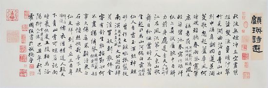 面临当今书坛,前面是艺高明垂的大师,后面是标新立异的新秀,霍国强不改初衷,不追时髦,不急功近利,不左右摇摆,以有思、有情、有趣、有境的踏踏实实的艺术实践去实现人格化力量的艺术至高追求。观其书法作品,刚柔相济,在刚劲雄浑大气中,又内涵秀丽圆润柔美,是中原书法和吴地书法的融合贯通,也是南北书法风格的完美结合。这些正是他在长期书法实践中不断努力进取的成果,成为他的书法艺术“看似寻常最奇崛”而区别于他人的自我特点,也是他书法艺术在继承传统中不断创新的成功之路。