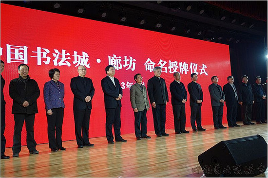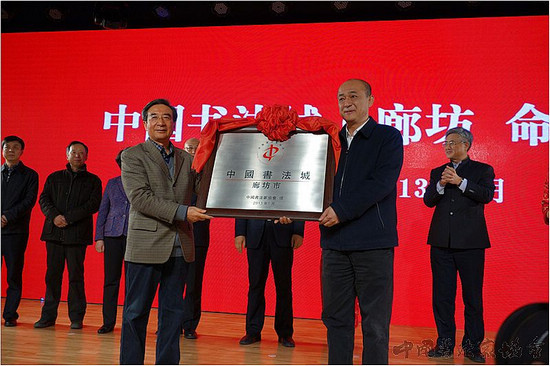 授牌仪式上,张陆一代表中国书协宣读《关于命名廊坊市为中国书法城的决定》。赵长青在讲话中对廊坊市获得“中国书法城”表示祝贺,他说:廊坊地处京畿腹地,历史悠久,文化积淀厚重,滋养了众多燕赵风骨的名人志士。近年来,廊坊的书法事业快速发展,书法团队异军突起,在全国重大书法展览和评奖中取得了可喜的成绩,从中可以看出,廊坊市高度重视文化建设,把发展繁荣书法艺术作为“文化强市”建设的重要组成部分。衷心希望廊坊市以成功创建“中国书法城”为契机,总结经验,着眼未来,开展面向全国具有廊坊特色的书法活动,提升档次,扩大影响,使书法艺术真正成为廊坊文化建设的标志性品牌,为书法事业的大发展大繁荣做出贡献。相金科、冯绍慧分别代表河北省委宣传部、廊坊市委发表了讲话。