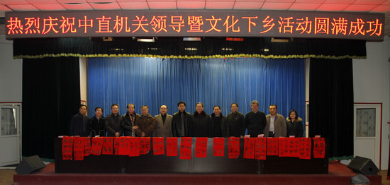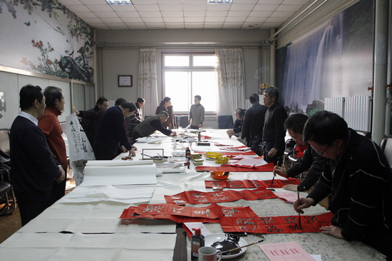 “平安即是家门福,孝友可为子弟风。”对于经历过北京“7·21”特大暴雨、正处于经济社会转型期的北京房山洪寺村来说,这副春联有着特别的意义。1月22日,由中直机关书画协会和协会团体会员单位广电总局书画协会的张瑞祥、陈树谦、孙平、赵辉、金玉杰、王书科、梁岳、边传久、关来顺等书法家组成的送文化下乡小分队,在中直机关书画协会主席武春河、中直机关工委群工部副部长舒家鑫的带领下,到北京市房山区城关镇开展送文化下乡活动,赠送部分图书,并为村民书写春联200余副。