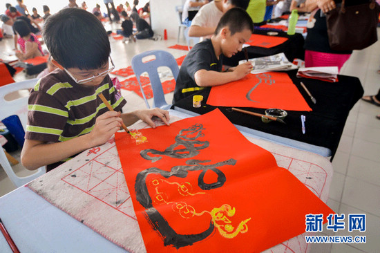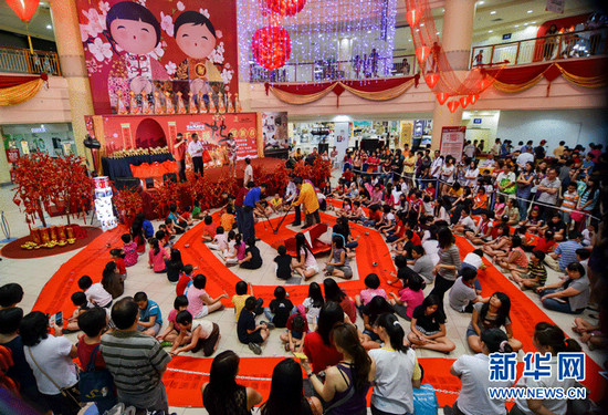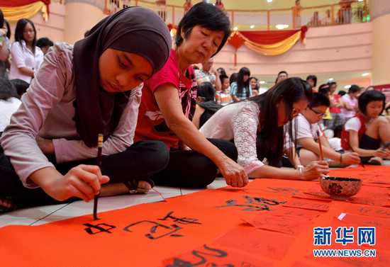 2013年1月27日在马来西亚雪兰莪州,参赛者在一条长达70米的“蛇”形红纸上书写创意“蛇”字。当日,马来西亚雪兰莪州巴生肖蛇联谊会举办灵蛇狂舞创意书写“蛇”字比赛,迎接“蛇年”春节的到来。 新华社发(张纹综摄)