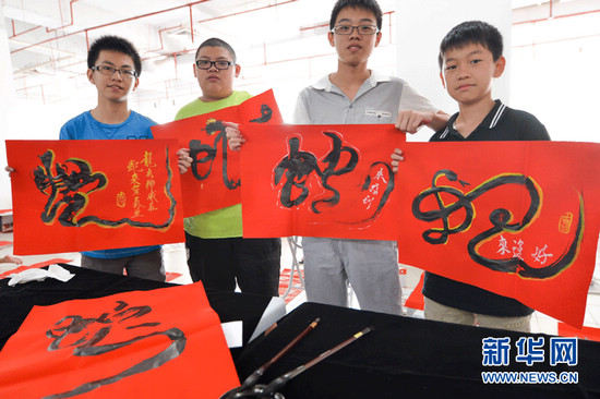 参赛者在一条长达70米的“蛇”形红纸上书写创意“蛇”字。
