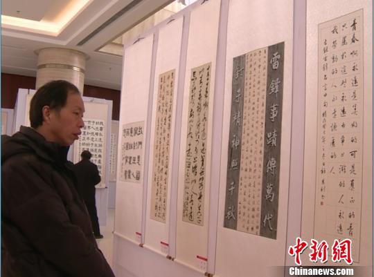 “书写伟大的人生”书法作品展26日在辽宁省抚顺市雷锋大剧院举办,图为市民参观书法作品。 张曼 摄