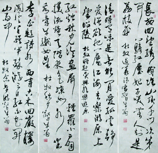 近日得观廖奔兄的数幅行草书新作,大有清风出袖、明月入怀之感。在雾霾连连的闷热酷暑,品一品廖奔兄的书法,似清流飞来,凉风而至,顿觉神清气爽。廖奔兄不以书法为主业,但他对书法的兴趣,所下的功夫,比一般书家还要大。他自幼学文习书,数十年来坚持不辍,楷、隶、行、草都练,行草学二王、学米芾、学黄庭坚,从各家中吸取营养,并逐渐形成自己的面目。他学书的路数较宽,其学书之路与其学问之路是一起走过来的。诗词歌赋、填曲记文与作书相辅相成、齐行并进。也就是说,他是一个学者书家,他的书风与他的文风是紧密联系的。廖奔兄的文笔清新奔放,其书风亦清新奔放。他的行草书风偏于清秀一路,清淳中见骨秀,更难得的是清新中含刚健,清秀中见奔放。结体清新自然,用笔挺拔刚健,能把清新清秀和刚健奔放结合在一起,且结合得很自然,是廖奔兄书法的特点。