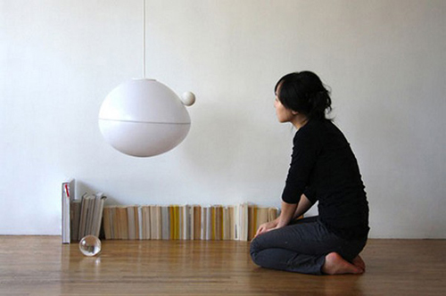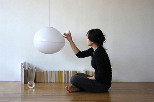 这款名为Fiat Lux的灯从形状上面来看非常的普通,样子也不太起眼,与我们平常看到的吊灯没什么两样,但它提供了一个趣味魔术性的开关。奥秘就在你看到的旁边的小球上面,这个小球其实是这款灯的开关,小球是浮着在灯的表面可以随意的移动。