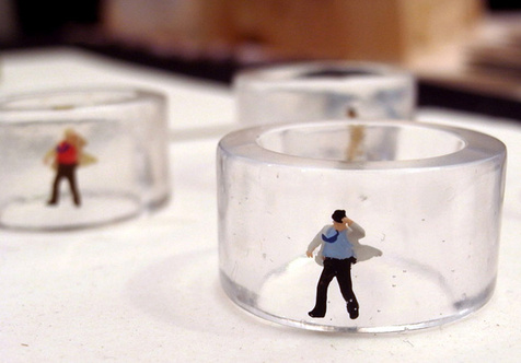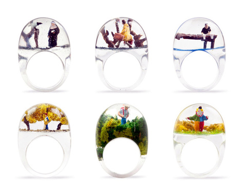 每一枚戒指都会有一段动人的故事,或热烈或恬静、或苦涩或甜美,总之拥有它的人一定会知道其中的滋味。香港设计师用几米漫画讲故事的方式将微观场景置于小小的戒指当中,让人很容易被这些被缩放了的浪漫景色勾起对往日美好时光的回忆。每枚戒指里的故事都有着不同的主题,从童真童趣到雪地里的修女,从远行的妇女到乡村的生活……戒指里面的世界如同童话般一样令人向往,如果能够选一枚送给心爱的人珍藏那就再好不过了。