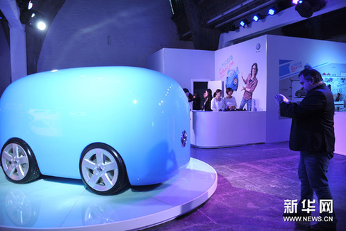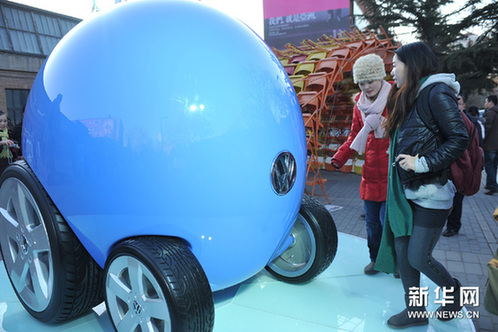 12月10日,在北京798艺术区,两名女孩在观看“大众自造”创意坊展出的创意车。新华网图片 刘长龙 摄