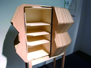 德国设计师Elisa strozyk和艺术家Sebastian neeb合作设计了这款“手风琴书柜”。这件储藏柜外部的薄木片层像手风琴一样被折叠起来。用激光切割的木片手工固定在一个织物(比如莱卡布料)表面上。这两种材料的巧妙结合,让木片表面像布料一样柔软有弹性。手风琴一样的表皮将矩形的柜子包裹起来,不用的时候它就像门一样可以关闭,绝对是个收纳小东西的好帮手。