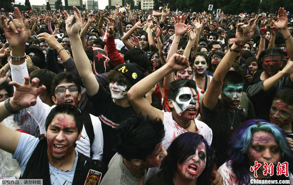 当地时间11月26日,墨西哥民众举行“僵尸大游行”,近万人装扮成各式各样的“僵尸”在广场上聚集。登记参加这次大游行的人共有9860人,主办方期望打破僵尸游行最多参与人数的吉尼斯世界纪录。