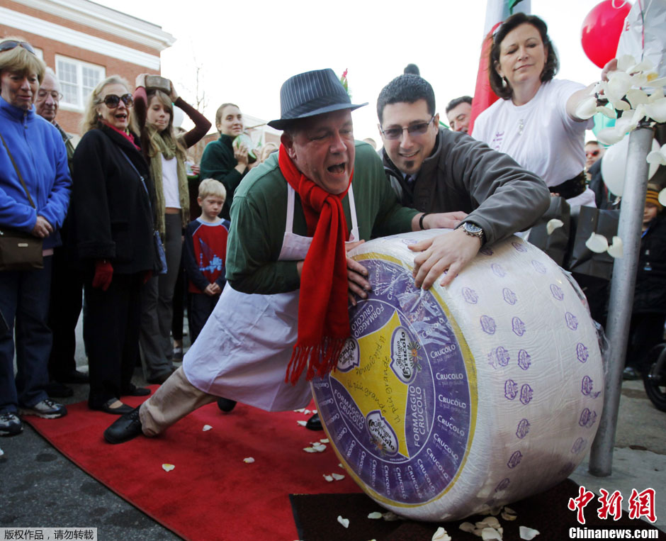 当地时间12月1日,美国马萨诸塞州康科德街头一家奶酪店外,老板推来一个重达181千克的奶酪轮(400磅)。据店家介绍,这个巨型奶酪轮号称世界上最大的奶酪,它的出现立马在街头引来众多路人的围观。据悉,这个奶酪轮将以每磅(0.45千克)19.99美元分割出售。