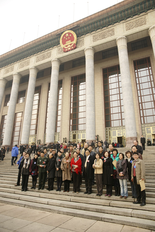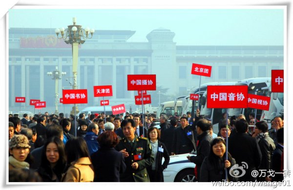 中国摄协工作人员手持“中国摄协”牌子在人民大会堂外迎候代表 万戈 摄