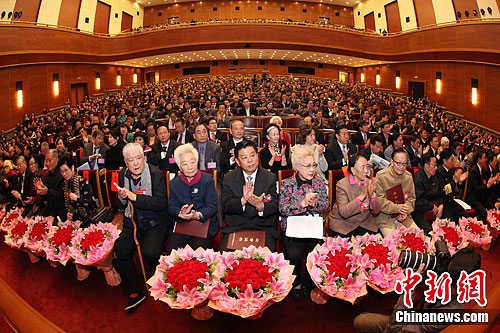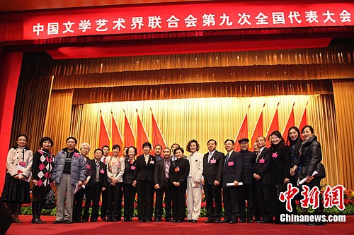 全国政协科教文卫体委员会副主任胡振民(前中),著名艺术家于兰(中左一)、秦怡(中右一)、李默然(中左二)等73位文艺工作者荣获kaiyun电子