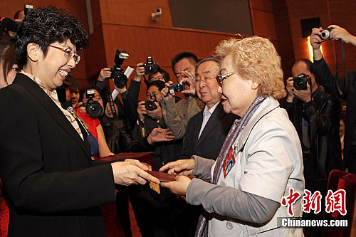 党组书记赵实(左)为荣誉委员郭兰英(右)颁发证书。王保胜 摄