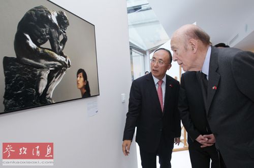 6月13日,法国前总统德斯坦(右)、新华社欧洲总分社社长王朝文参观在法国巴黎