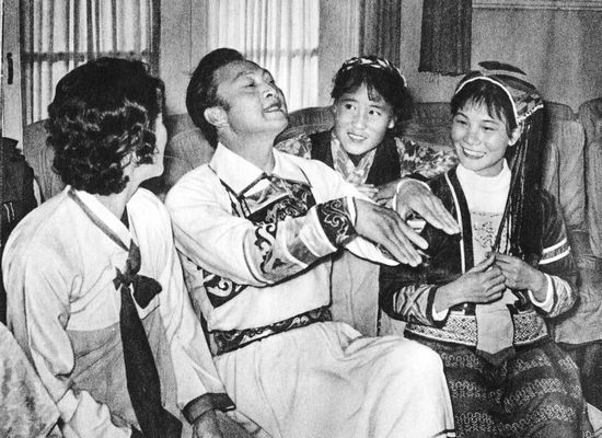 图二:著名舞蹈家贾作光向少数民族舞蹈演员传授舞艺