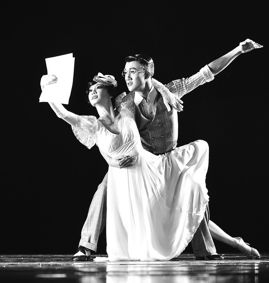 在这次剧目课汇报中,双人舞作品《再别康桥》在创编中将人物细腻丰富的情感与国标舞元素相融合,呈现了徐志摩与林徽因唯美的爱情故事。正如那句“轻轻地我走了/正如我轻轻地来/我挥一挥衣袖/不带走一片云彩”表达了徐志摩对康桥的爱恋,对往昔生活的留恋,对眼前的无可奈何的离愁。舞蹈表现得真挚、隽永,画面唯美,情感丝丝入扣。整个作品从林徽因捡到徐志摩的情诗开始,表现林徽因暗恋时的青涩、纯真,到遇见徐志摩时内心的喜悦和害羞,再到两人一起读诗时的快乐、彼此喜欢,直到最后两人分开,徐志摩无情的离去……