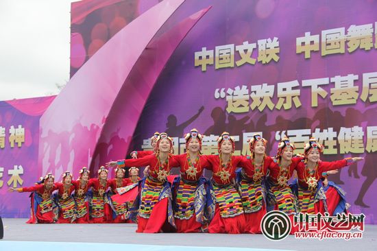 中国舞协副主席、西藏自治区舞协主席丹增贡布和云岩区云飞社区舞蹈一队共同跳起百姓健康舞《吉祥谣》中国艺术报记者乔燕冰摄