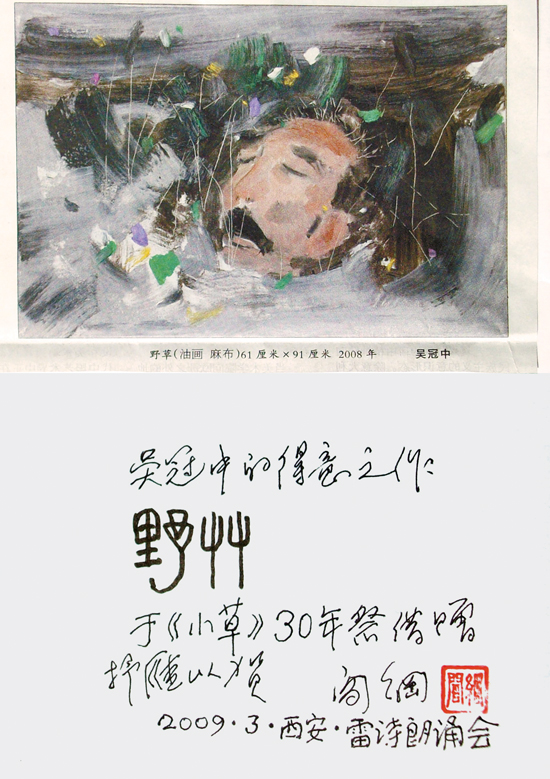 雷抒雁是新时期以来,继他崇拜的艾青之后杰出的诗人,我为他庆幸。西安那天,借花献佛,赠他一幅油画(剪贴),上写: