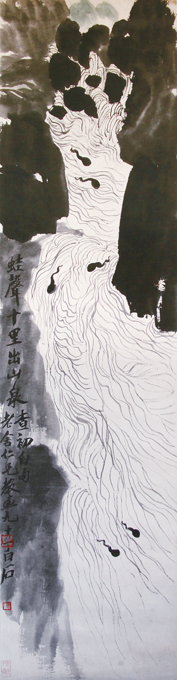 齐老人得信之后,超水平地创作了两幅杰作,其中对《蛙声十里出山泉》,他用重墨在纸的两侧画了一个山涧,急湍的山泉在山涧中流淌,水中游曳着六只小蝌蚪,上方用石青点了两个青青的远山头,青蛙妈妈在那里呢,她的声音传出了十里之遥,到了山涧的这头。画作完成之后,在老舍先生客厅挂出之后,消息立刻传向四方,轰动一时,成为中国文坛画坛一桩大事。这大致是1951年秋天的事。当时流传的说法是,老人得到命题后冥思苦想了三天三夜,终于找到了灵感,提笔完成了有奇妙构思的绝品。当朋友们询问时,老舍先生自己也这么说,总是对老人的聪明才气和创作水准倍加赞赏,称他不愧是世界级的美术大师,91岁啊!