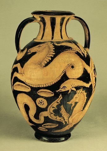 绘有海蛇的双耳细颈椭圆土罐,古伊特鲁里亚艺术品,公元前4世纪。