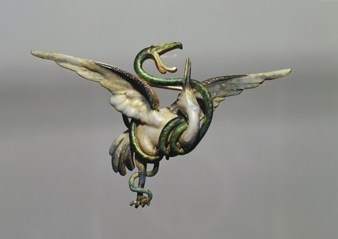 鹳与蛇的珐琅胸针,约1900。