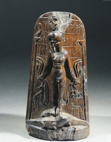 古埃及石碑,碑身刻有古埃及太阳神何露斯,双手各抓两条毒蛇,周身被咒语包围,石碑被修行者用来练习抵御野兽的魔法,,公元前5世纪。