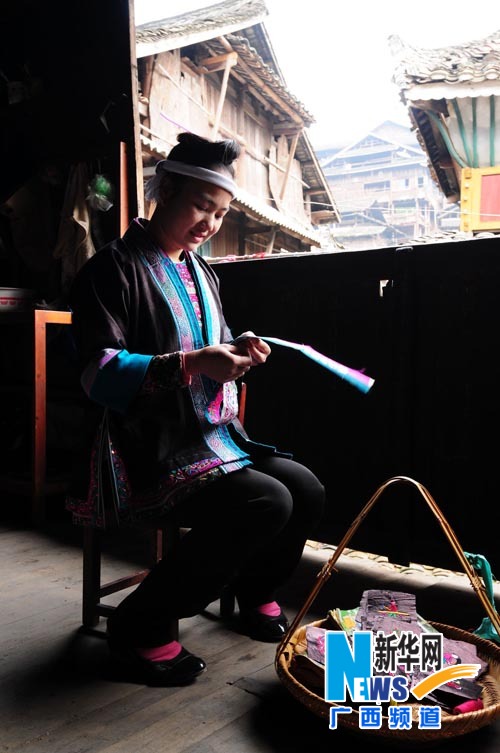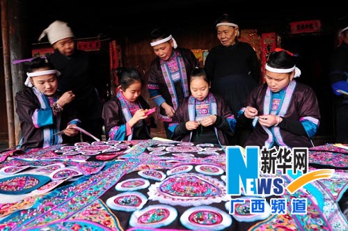 1月26日,广西柳州三江侗族自治县同乐乡同乐村侗族群众在刺绣。