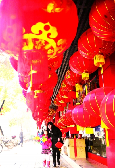 随着春节的临近,各种带有浓烈节庆气氛的灯笼、春联、年画和年糕、春饼等年货,已在全国各地热销。图为群众在江西省龙南县红旗大道一家饰品店选购大红灯笼。本报记者 刘新武摄