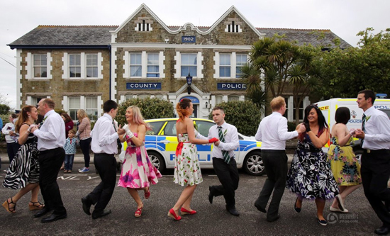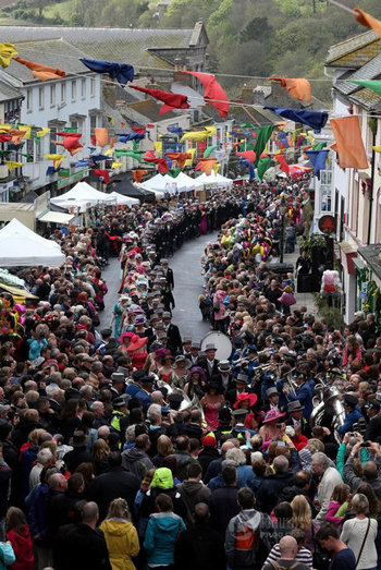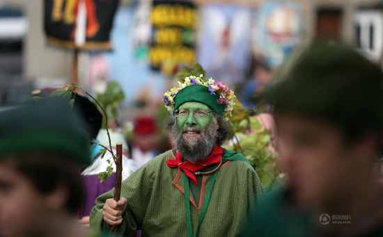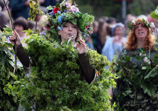 当地时间2013年5月8日,英国赫尔斯顿,当地民众庆祝传统节日“花神节”(Flora Day)的到来。花神节堪称英国沿袭至今最古老的风俗。每到这一天,人们盛装打扮、四处起舞,庆祝冬天的逝去,迎接春天的来临。其中,最引人注目的是“正午之舞”,这在历史上曾是城镇上流社会人士的跳舞时间,如今男子仍然头戴大礼帽、身穿燕尾服,女子也换上最高级的礼服起舞。