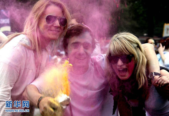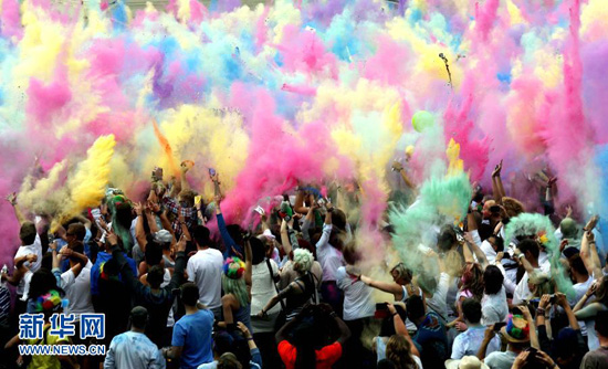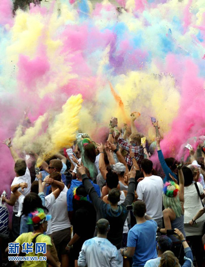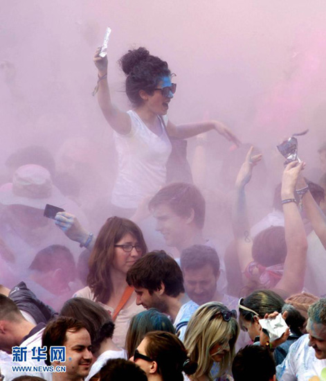 5月11日,人们在德国柏林庆祝色彩节。当日,上万民众在柏林城西奥林匹克骑马场抛撒彩色粉末,欢庆色彩节。色彩节源于印度三大节庆之一的“胡里节”,人们用五彩缤纷的颜色来送别单调的冬季、喜迎生机盎然的春天。德国数个城市于2012年开始每年定期欢庆色彩节。新华社记者潘旭 摄