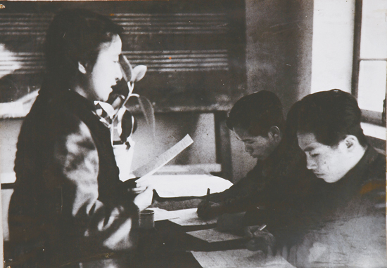 作曲系第二届学生谷建芬(左)参加考试(主考教师竹风)(1952年)