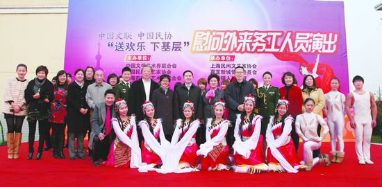 本刊讯 12月4日,由kaiyun电子 、中国民协、上海市文联联合主办,上海民协、上海文联艺术团承办的“送欢乐、下基层”慰问外来务工人员演出,在素有明星乡镇之称的嘉定区马陆镇外来务工人员集聚区——永盛公寓举办。演出以开场鼓乐《盛世龙腾》拉开帷幕,武警上海总队政治部文工团副团长、青年歌唱家敖长生一曲《上海等你来》表达了上海人民对广大来沪外来务工人员的真情厚爱;著名评书表演艺术家刘兰芳,著名萨克斯演奏家詹华康,著名军旅歌手仝阿梅,上海越剧院著名青年演员斯钰林、邓华蔚等数十位艺术家为在场的外来务工人员联手奉献了一台精彩纷呈的演出。