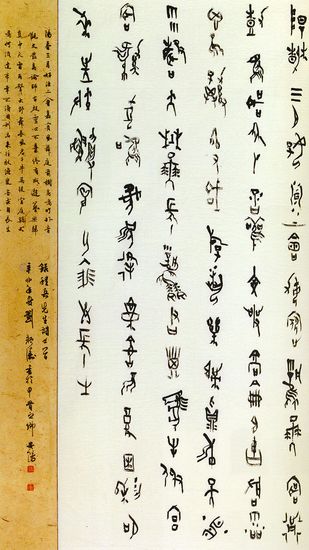 “书体之祖篆书,经历了由简单的甲骨到复杂的金文,再到简单的小篆的演变过程,也是文字从古拙到沉雄再到绝对对称、规范的过程;如果我们不仅从单个字的艺术风格去评析,篆书也能反映出人心、社会从原始到复杂的过程。”