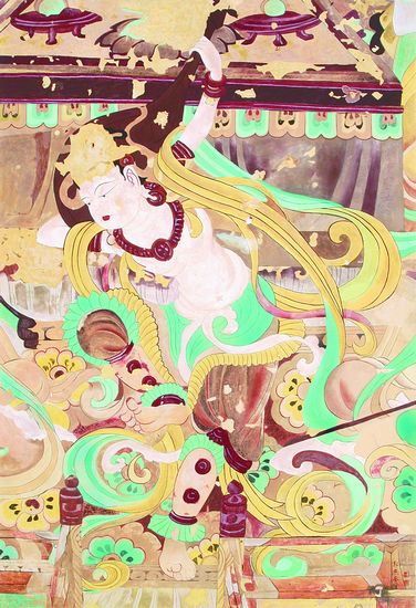 在“敦煌遗韵”中,展出了多幅郭燕春临摹的敦煌壁画作品,其中包括敦煌一一二窟反弹琵琶、一五九窟伎乐、四一○窟供养菩萨和安西榆林第十七窟菩萨等,色彩瑰丽、形态各异、神态逼真。在“云山如梦”中,孔德众创作的40多幅具有宋代风格的山水画则为人们展现了宋人崇尚自然、追求高品位生活方式的审美情趣。在“花鸟清趣”中,郭燕春创作的花鸟画深受宋代画院体影响,秀润典雅,明快而富于变化,追求清雅唯美的诗意境界。