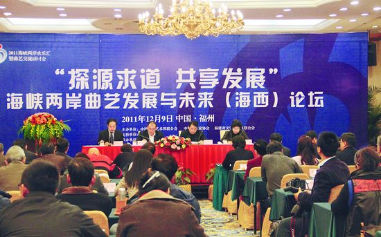 以“探源求道 共享发展”为主题的海峡两岸曲艺发展与未来论坛,12月9日在福州举办,来自海峡两岸和新加坡的曲艺家、曲艺工作者以中华“根”文化为纽带,在全球经济一体化背景下,探索文化多样性和民族曲艺文化传承发展,分析两岸曲艺交流现状与合作发展趋势、闽台曲缘文化、曲艺创作与创新、曲艺传承、曲艺市场等问题,梳理两岸曲艺交流活动,交流发展曲艺新理念,明确闽台曲艺在两岸曲艺交流中的重要地位并达成共识。研讨会上,董耀鹏、姜昆、大兵以及台北曲艺团团长郭志杰,中国台湾相声、评书演员叶怡钧,新加坡相声演员徐惠民,福建艺术学院教授赵日和,分别就《两岸曲艺文化交流合作与发展的思考》《转型时期中国曲艺的文化担当》《相声创作之我见》《台北曲艺团经营运作之现况》《曲艺传承的新思维》《新加坡与海峡两岸的相声交流》《闽台曲缘文化》作了专题发言。中国曲协还与福建省文联签署了支持福建曲艺科学发展对台先行先试的合作发展备忘录,为两岸曲艺合作交流可持续发展提供理论支持和制度保障。大家表示,海峡两岸曲艺文化一脉相承、相互交融,你中有我、我中有你。两岸曲艺独特的民族风格、浓郁的乡土气息、优美的抒情曲调、擅长抒发恋人思亲和游子怀乡的真挚情怀,以及雅俗共赏的审美特征,共同构筑了海峡两岸民众共有的“精神家园”。