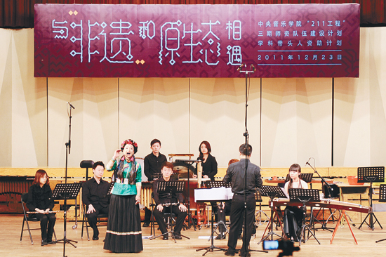 12月23日晚,由著名作曲家郭文景组织策划的“211工程”项目音乐会《与“非遗”和原生态相遇》在中央音乐学院音乐厅上演。这是一个针对作曲家的规定性征曲计划,要求其作品必须与我国某项非物质文化遗产的传承人或某种民族民间原生态艺术艺人合作并以音乐会的形式完成。通过评选作曲家的申请计划案,最终选择了周娟、胡银岳、陈欣若、史付红四位当代青年作曲家。