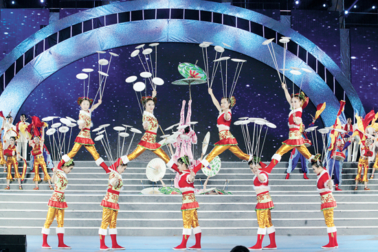 “燕赵太平颂”以吴桥杂技和坝上吹打这两朵河北艺术的奇葩先声夺人,为观众呈现出色彩缤纷、令人眼花缭乱的艺术场面。抖空竹、登坛子、戴草帽、转碟、近景魔术等等,各种杂技技术技巧的奇难巧美,赢得了观众一次次的喝彩。歌剧《白毛女》、河北民歌《放风筝》《小放牛》、通俗演唱《回娘家》,以及评剧《刘巧儿》选段,都仿佛散发着泥土的芬芳,质朴的气息扑面而来。河北籍作家王蒙的小说《青春万岁》承载了几代人青春的理想和追求,张铁林饱含深情地朗诵了小说中的诗歌《所有的日子都来吧》,令人不禁要赞美青春,赞美这朝气蓬勃、欣欣向荣的伟大时代。合唱《没有共产党就没有新中国》无疑表达了全国各族儿女真挚的深情与心声。燕赵大地物华天宝,人杰地灵。不仅孕育了吴桥杂技、评剧、河北梆子等艺术形式,哺育了许许多多优秀的人才和慷慨悲歌之士,这方神奇的土地上,更有着光荣的革命历史传统。西柏坡,这个静静的村庄曾经是解放战争时期党中央指挥战略决战的指挥所,也是共产党“进京赶考”前的最后一站。“我们的大地为什么百花盛开”,“我们知道从哪里来,到哪里去”,“从人民中来,到人民中去”,王晓棠、田华等八一厂电影演员们激情充沛地朗诵了《西柏坡抒怀》这首饱含深意和哲理的诗歌,吕思清的小提琴、孙颖迪的钢琴伴奏,则为这首大气的诗歌送上优美和谐的旋律,与诗朗诵珠联璧合、相得益彰,令人在抒怀回眸中畅想与深思。