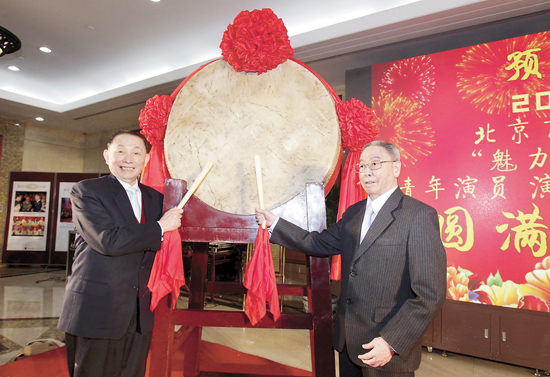 2月16日,著名京剧表演艺术家梅葆玖(左)、谭元寿为擂台赛擂响“战鼓”。