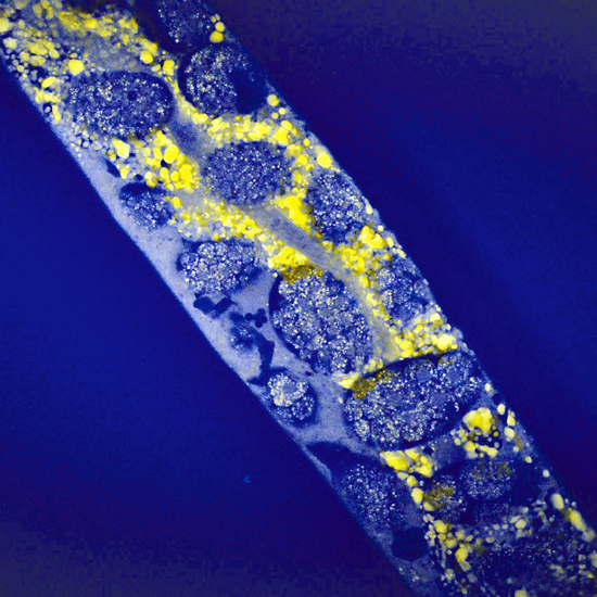 这是一幅无标记的显微成像图片,该作品运用现代最新成像技术CARS系统(Coherent Anti-Stokes Raman Scattering反斯托克斯拉曼散射显微术)观察得到的图像,在技术上具备先进性,具有重要的学术价值和应用意义。